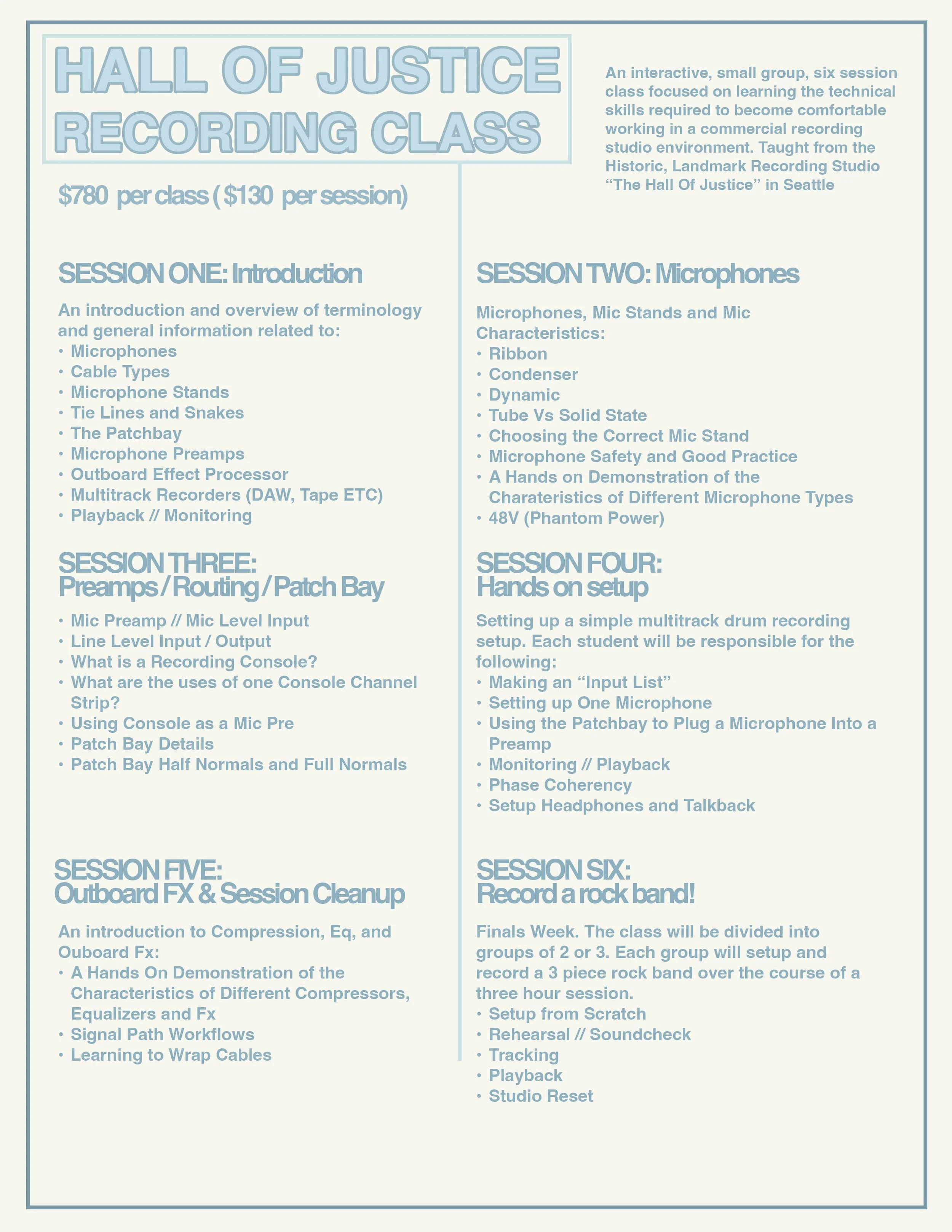 Introducing the Hall Of Justice Recording Class! An interactive, small group, six session class focused on learning the technical skills required to become comfortable working in a commercial recording studio environment. Taught from the Historic “Hall Of Justice” Recording Studio in Seattle
